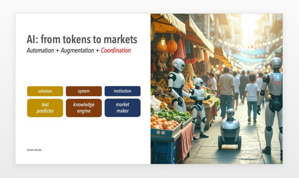 AI: From Tokens to Markets (Accoto 2025) – qui una slide da un mio recente intervento corporate sulle frontiere delle nuove ingegnerie istituenti. Cos’è, dunque, filosoficamente un large language model: un text predictor, un knowledge engine o un market maker?