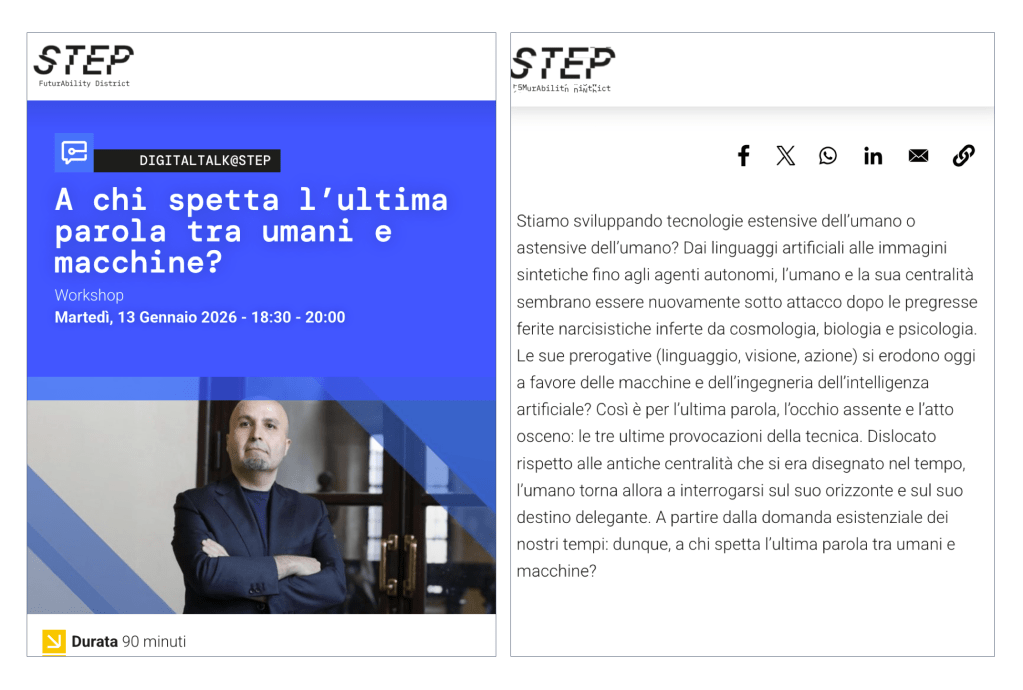 Un mio intervento filosofico disturbante intorno alle nuove condizioni di possibilità del significare e dell’agire umani nell’era delle macchine istituenti. Ne discuteremo insieme martedì 13 gennaio 2026 a STEP FuturAbility Discrict (inspired by Fastweb + Vodafone) in un workshop aperto al pubblico milanese in Piazza Olivetti 1. Vi aspettiamo per capire a chi spetta l’ultima parola!