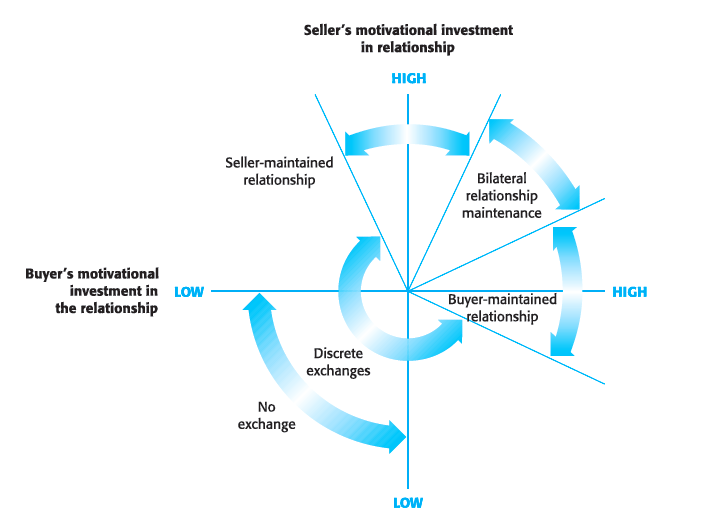 Dwyer et al. (1987, p. 14) suggest that the type of relationship that develops between a supplier and a customer is determined by the different amounts of motivational investment that buyers and sellers are prepared to commit to the relationship. They hypothesise that there are four types of active relationships in addition to ‘no exchange’ (Egan, p. 53)