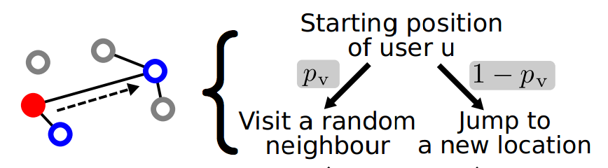 “Daily interactions naturally dene social circles. Individuals tend to be friends with the people they spend time with and they choose to spend time with their friends, inextricably entangling physical location and social relationships. As a result, it is possible to predict not only someone’s location from their friends’ locations but also friendship from spatial and temporal co-occurrence. While several models have been developed to separately describe mobility and the evolution of social networks, there is a lack of studies coupling social interactions and mobility. In this work, we introduce a new model that bridges this gap by explicitly considering the feedback of mobility on the formation of social ties. Data coming from three online social networks (Twitter, Gowalla and Brightkite) is used for validation. Our model reproduces various topological and physical properties of these networks such as: i) the size of the connected components, ii) the distance distribution between connected users, iii) the dependence of the reciprocity on the distance, iv) the variation of the social overlap and the clustering with the distance. Besides numerical simulations, a mean-eld approach is also used to study analytically the main statistical features of the networks generated by the model. The robustness of the results to changes in the model parameters is explored, finding that a balance between friend visits and long-range random connections is essential to reproduce the geographical features of the empirical networks” (from “Entangling mobility and interactions in social media”, 2013)