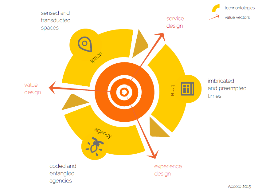Forget the Big Data 3V’s. Tuning my framework grounded on: 1) time, 2) space and 3) agency. I started to call it “digital realism” to stress the process of digital eversion of the real. I think it’s time to go beyond the current trivial big data and digital transformation discourse and to focus on 3 foundational dimensions: 1) imbricated and preempted time, 2) sensed and transducted space and 3) coded and entangled agency and to stress 3 business vectors grounded on this technontological architecture: a) value design; b) service design and c) experience design (Accoto 2105)