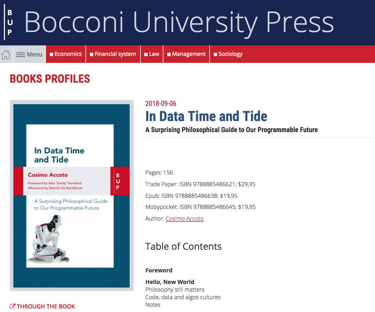 Officially hit international store shelves >> “In Data Time and Tide. A Surprising Philosophical Guide to Our Programmable Future” (Accoto, Bocconi University Press, 2018). More info about the English version of my book “Il Mondo Dato” here
