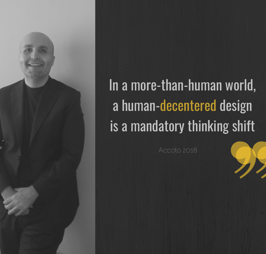 “In a more-than-human world, decentering the ‘human’ in the so-called experience design is a mandatory thinking shift. Designing is always ontological: it’s about making worlds, not just creating experiences” (Accoto 2018)