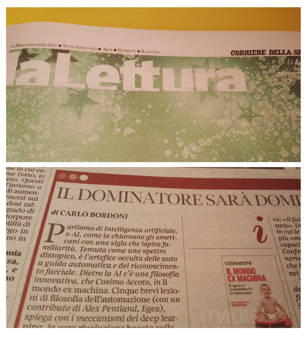 “Il mondo ex machina” su La Lettura del Corriere della Sera segnalato da Carlo Bordoni, sociologo dei processi culturali, coautore e collaboratore di Zygmunt Bauman. Una felice sorpresa anche il richiamo qui al mio precedente saggio “Il mondo dato”. Con l’occasione, lo ringrazio di cuore per la lettura e l’apprezzamento di entrambi