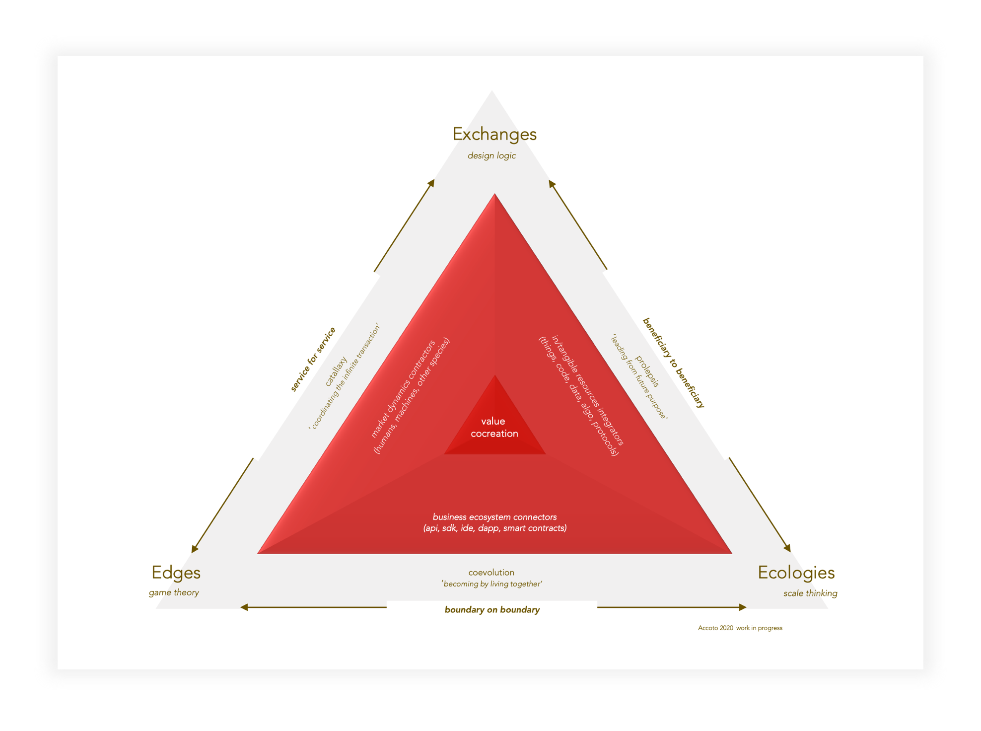 “In un contesto esplorativo e interpretativo che chiamo delle tre E di “exchanges, edges, ecologies”, il focus di questo preliminare framework di sintesi è all’incrocio dinamico di: a) processi economici di catallassi (dinamiche umane/inumane di scambio di servizi tra beneficiari), b) pratiche della liminalità d’impresa (meccanismi di connessione e flusso inter-aziendali), c) tensioni ecoopetitive (pratiche di integrazione di risorse, competizione e collaborazione in ecosistemi/ecologie di cocreazione del valore). Design logic per progettare e costruire interazioni e transazioni multi-agente (agentività sia antropiche sia negantropiche), game theory per gestire coopetitivamente aperture e sconfinamenti infra/infostrutturali (api, sdk, smart contracts…), scale thinking per valorizzare ecosistemi di servizio, coemergenti e coevolventi, scalari e orientati dal/al futuro (su scale logistiche, geografiche, industriali, organizzative…). Il tutto integrando risorse tangibili e intangibili, operanti ed operande: materiali, oggetti, dati, codice, algoritmi, protocolli. Dunque, l’orizzonte di uno scambio infinito ai confini porosi delle imprese dentro nuove ecologie di cocreazione di valore e di senso” [Accoto 2020, in progress]