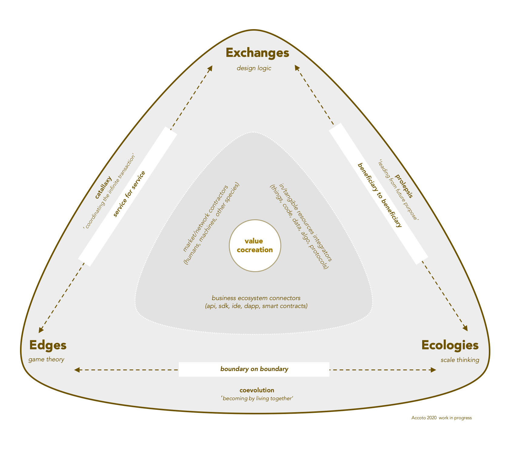 “In un contesto strategico che chiamo delle tre E (exchanges, edges, ecologies o anche scambi, sconfinamenti, scale), questo diagramma di sintesi incrocia: a) processi economici di catallassi (dinamiche umane/inumane di scambio di servizi-per-servizi tra beneficiari), b) pratiche della liminalità d’impresa (meccanismi di apertura, connessione e flusso inter-aziendali), c) tensioni ecoopetitive (pratiche di integrazione di risorse, competizione e collaborazione in ecosistemi/ecologie di cocreazione del valore). Dunque, design logic per progettare e costruire interazioni, contrattazioni, transazioni multi-agente (agentività sia antropiche sia negantropiche), game theory per gestire coopetitivamente sconfinamenti infra/infostrutturali (api, sdk, ide, smart contracts), scale thinking per valorizzare ecosistemi di servizio, coemergenti e coevolventi, scalari e prolettici cioè orientati dal/al futuro (su scale varie: geografiche, industriali, organizzative). Il tutto integrando risorse tangibili e intangibili, operanti ed operande, proprietarie e non proprietarie, automate o meno: materiali, oggetti, dati, codice, algoritmi, protocolli. Due i vettori strategici per le imprese: la catallassi e la prolessi” [Accoto 2020]