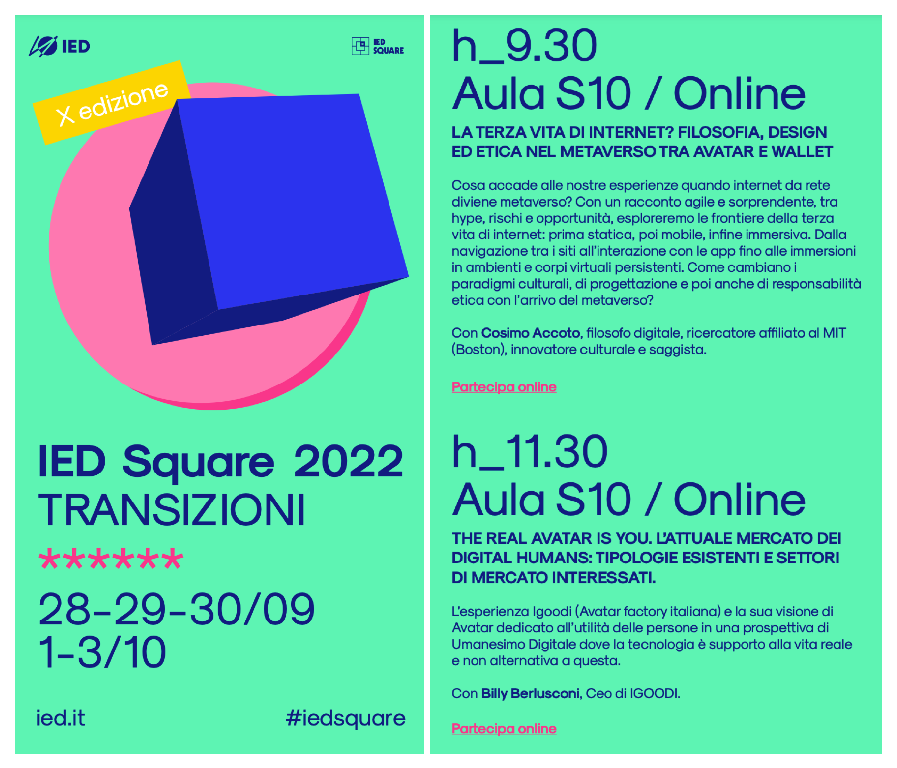 [evento] sarò ospite e speaker alla decima edizione di “IED Square 2022”, la settimana di didattica immersiva dedicata a studentesse e studenti (circa 1500) del 3° anno di tutte le sedi italiane dell’Istituto Europeo di Design. Quest’anno l’evento per la prima volta si presenta in versione festival aprendosi anche al pubblico esterno. Con le parole degli organizzatori: “L’intento dello spazio di confronto e condivisione sui temi della contemporaneità – momento di stimolo soprattutto per gli studenti al terzo anno che si avviano al loro percorso di tesi – è quello di mettere a fuoco il delicato momento storico che il mondo attraversa, fornendo chiavi di lettura che possano servire da guida per leggere e interpretare il presente e orientarsi nel futuro”. Un grazie a IED per l’interesse verso le mie esplorazioni tecnofilosofiche azzardate, per l’invito e l’ospitalità calorosa. Ci vediamo allora Milano. La mattinata del 3 ottobre tra metaversi (Accoto) e avatar (Berlusconi). Il mio intervento: “La terza vita di internet? Filosofia, design ed etica nel metaverso tra avatar e wallet”. Un grazie a IED per l’interesse e l’invito. Info sul sito IED nei commenti
