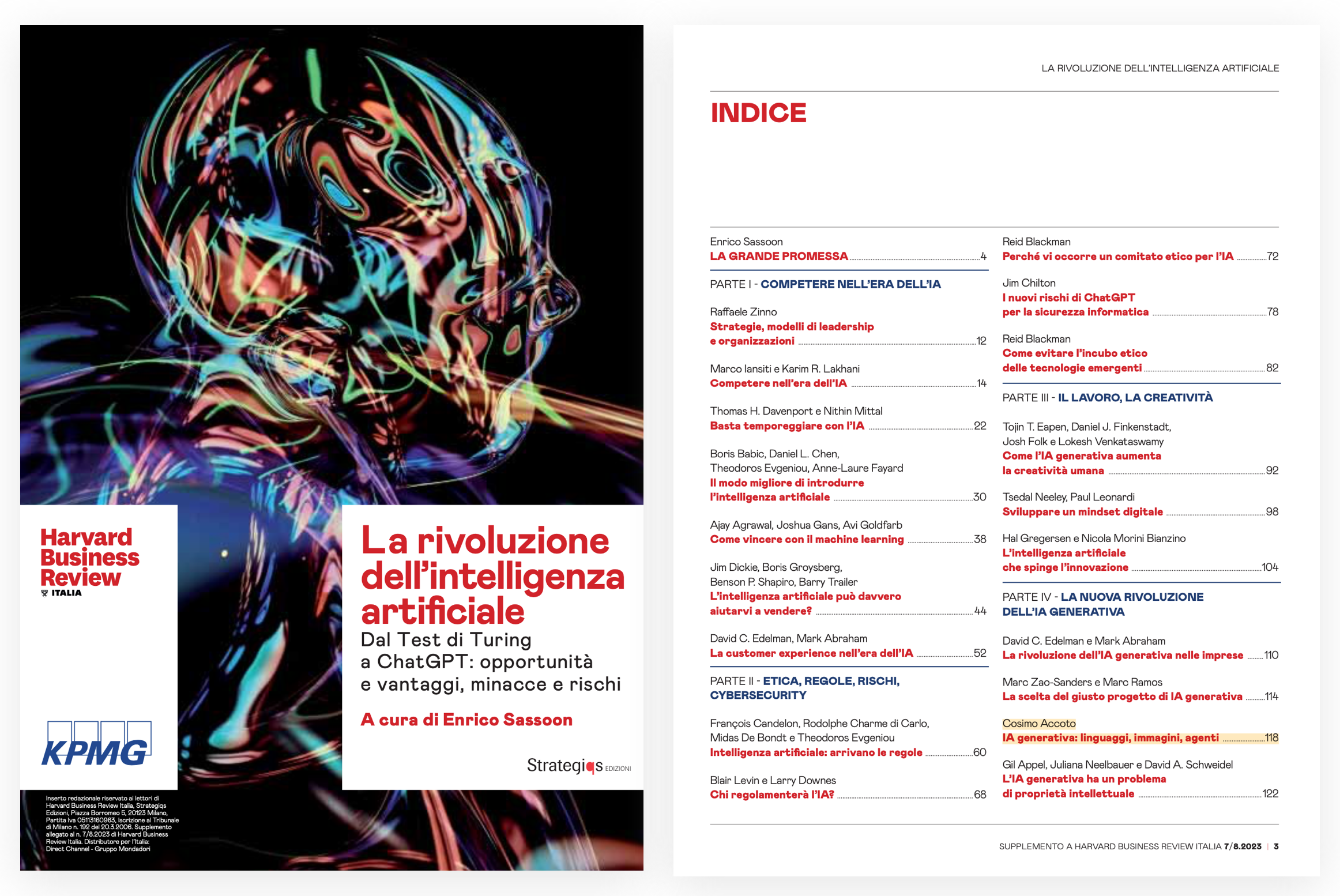 [magazine] E’ ora disponibile online e da inizio settimana prossima anche in edicola l’ultimo numero di Harvard Business Review Italia (Luglio/Agosto 2023) che si propone con un allegato speciale sull’AI (qui sotto la copertina e l’indice degli articoli). Un volume collettaneo fondativo e imperdibile per la ricchezza e la solidità delle prospettive e degli interventi strategici e manageriali. Con l’occasione, ringrazio il direttore di HBR Italia Enrico Sassoon per l’inclusione nel volume di un mio contributo sull’AI generativa tra linguaggi, immagini e agenti. Da non perdere!