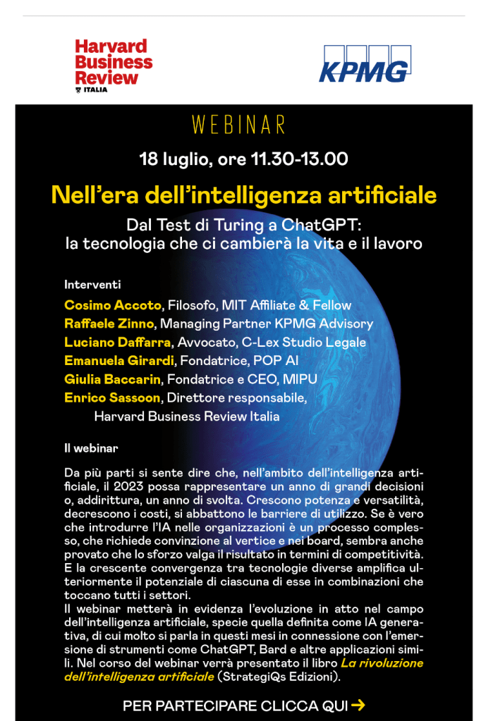 [webinar] Sarò speaker al prossimo webinar di Harvard Business Review Italia (18 luglio, 11.30-13.00) dedicato all’impatto dell’intelligenza artificiale generativa su economia e società in occasione del lancio del volume allegato al numero della rivista appena uscito (“La rivoluzione dell’intelligenza artificiale”, HBR luglio/agosto 2023). Al volume ho contribuito con un articolo sulla nuova era inflattiva dell’AI generativa tra linguaggi, immagini e agenti (per iscriversi al webinar trovate il riferimento al primo commento). E’ un nuovo ‘moonshot moment’ -come l’hanno definito i ricercatori di Stanford (HAI) e altri esperti a colloquio con il Presidente Biden questo 20 giugno in California- per il quale hanno richiesto un impegno storico d’investimento finanziario e culturale paragonabile ad altri momenti di svolta dell’umanità. Oltre l’hype, guarderemo alla portata epocale di questo passaggio tra potenzialità e vulnerabilità. Un grazie al direttore di HBR Italia Enrico Sassoon per l’invito a contribuire al volume e al webinar e per l’apprezzamento verso le mie esplorazioni tecno-filosofiche strategiche sulla generative AI.