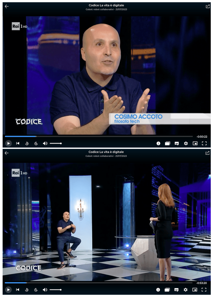 [TV] Ieri sera nuovamente ospite su RAI 1 nel programma CODICE di Barbara Carfagna per parlare di economia della macchina, di automazione delle tre m (mani, menti, mercati), di nuove divisioni del lavoro e dell’innovazione culturale necessaria a fronteggiare le provocazioni intellettuali dell’intelligenza artificiale generativa (la scrittura senza l’autore, l’immagine senza il referente, l’agente senza l’umano). Se l’avete persa, potete rivedere la puntata per intero su RAI PLAY. Un grazie di nuovo a Barbara e alla produzione per l’invito e l’ospitalità super professionali in questa nuova puntata … Buona visione!
