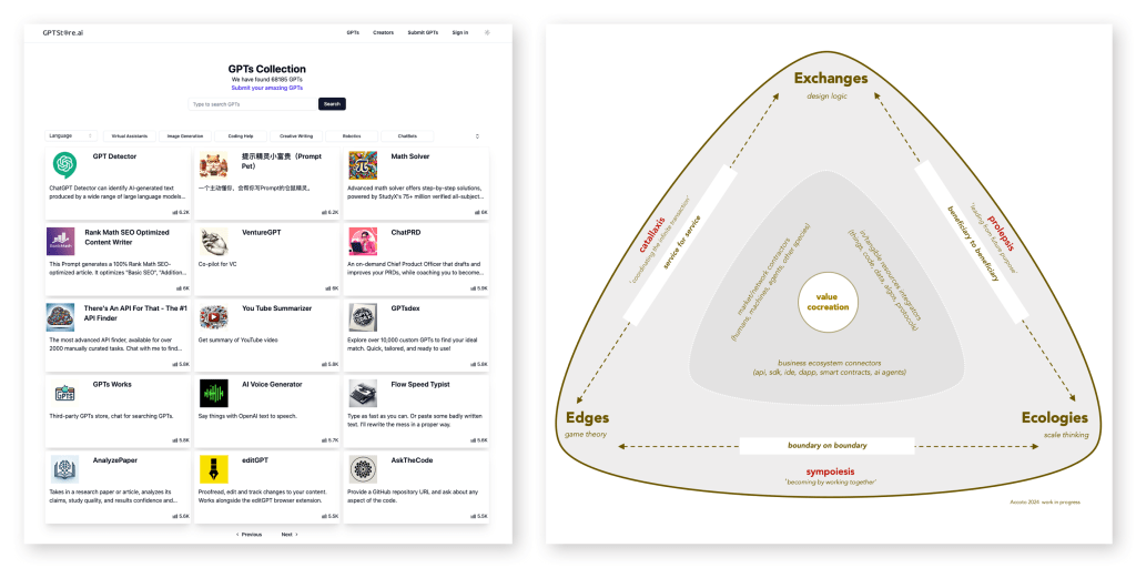 << La notizia del lancio di GPT Store da parte di OpenAI riporta alla ribalta della cronaca la questione della platform economy. Con un percorso strategico che classicamente -dovremmo oramai saperlo- muove da ‘product’ a ‘platform’ (dai modelli linguistici ai modelli di business, diremmo in questo caso con un facile gioco di parole), la sfida competitiva delle imprese che sviluppano soluzioni di intelligenza artificiale (estrattiva, discriminativa, predittiva, generativa e agentiva) entra intenzionalmente in una nuova fase. OpenAI disvela, così, il suo divenire ‘platfirm’ (un’azienda-piattaforma) – per usare un neologismo che ho introdotto nel 2015 – e, con questo, anche l’intenzione di avviare nuove forme e dinamiche di creazione del valore. Di, fatto, nell’era degli ecosistemi di servizio e dei marketplace a piattaforma, la cocreazione di valore diviene filosoficamente un dispositivo catallattico (di transazioni), simpoietico (di coevoluzioni), prolettico (di anticipazioni) attraverso cui attori economici eterogenei -antropici e negantropici- automaticamente e contestualmente scambiano servizi e integrano risorse di varia natura (operanti e operande, tangibili e intangibili, proprietarie e non proprietarie, automate ed eteromate, orizzontali e verticali). Un assemblaggio-ecosistema-stack di umani e non-umani che si popola di token e prompt, di creator e user, di developer e library, di builder e agent, di tag e rag e che cerca di istanziare un vantaggio competitivo centrato su reti, scale e flussi. Di fatto, questi emergenti modelli di business (e di leadership di mercato) cercano di valorizzare proprio gli ‘effetti di rete’ (network effects), gli ‘effetti di scala’ (scale effects) e gli ‘effetti di flusso’ (flow effects). Effetti che scardinano radicalmente le liminalità classiche dell’impresa tra architetture dell’evento, data flow e flow interaction, ontologie della scala e che richiedono nuovi sguardi interpretativi (es. 3E map: exchanges, edges, ecologies, Accoto 2024). Quali sono, dunque, gli obiettivi di questo sconfinamento? Leadership, interoperabilità, produttività, monetizzabilità, certamente. Ma anche il valore prodotto da ecosystem learning, business experimentation e strategic integration necessari a fronteggiare incertezza e turbolenza dei mercati competitivi. Più astrattamente, allora, possiamo dire che le piattaforme non competono sic et simpliciter nella produzione di nuovi prodotti e merci rivali o nell’erogazione di nuove esperienze e servizi mirati. Piuttosto e più radicalmente, in qualità di novelli demiurghi, competono nella costruzione inflattiva di nuovi mondi. La loro è una competizione all’inesistente più che una competizione all’esistente. Fondamentalmente, è una strategia competitiva più per horror vacui del futuro che per horror pleni del presente >> (Accoto 2024)