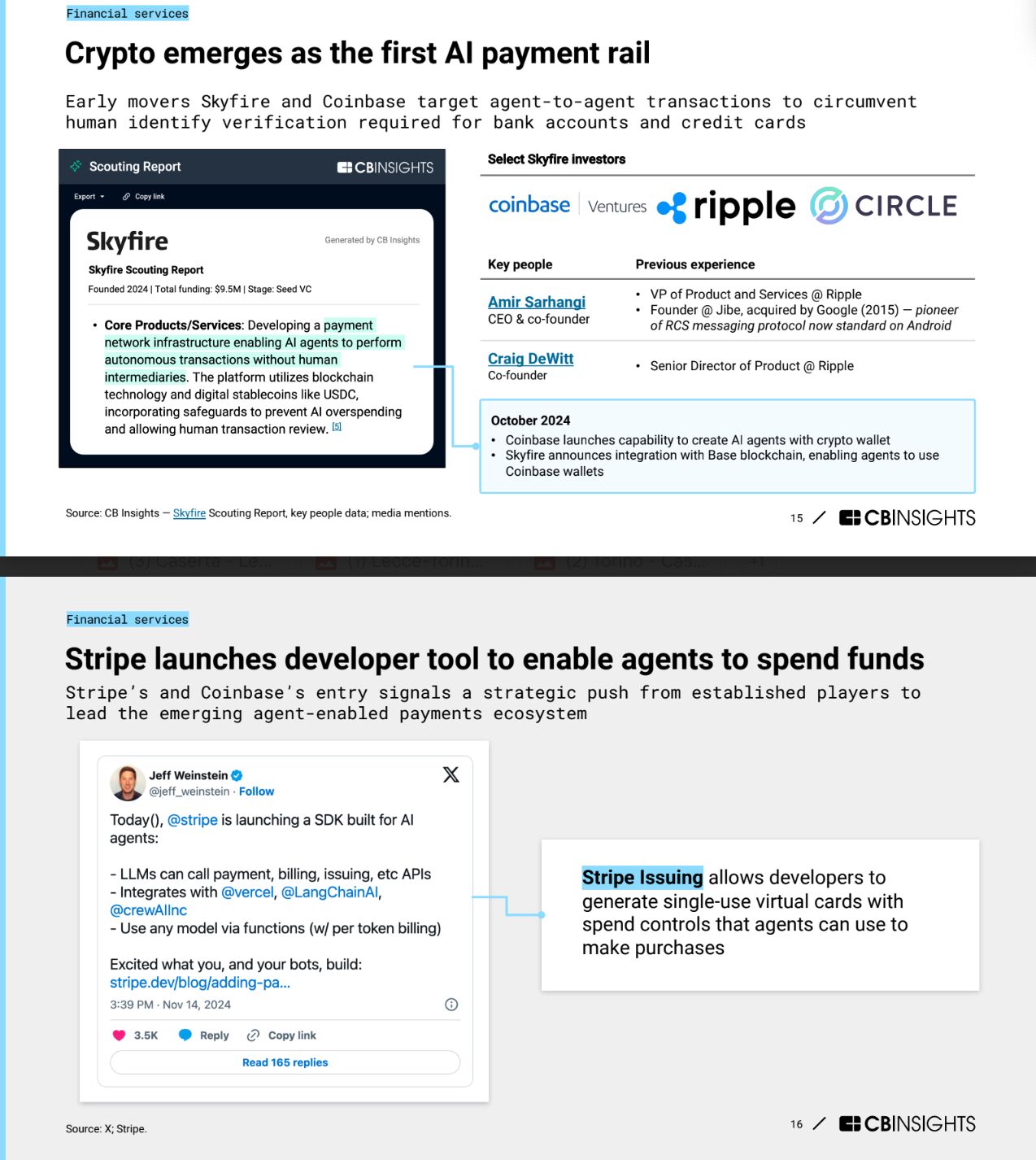 < AI agents are getting money to spend. In the last few weeks: Stripe dropped a developer tool to enable agents to spend $$ (e.g., access virtual cards); Coinbase launched the capability to build AI agents with crypto wallets; AI agent payments startup Skyfire raised funding from Coinbase Ventures