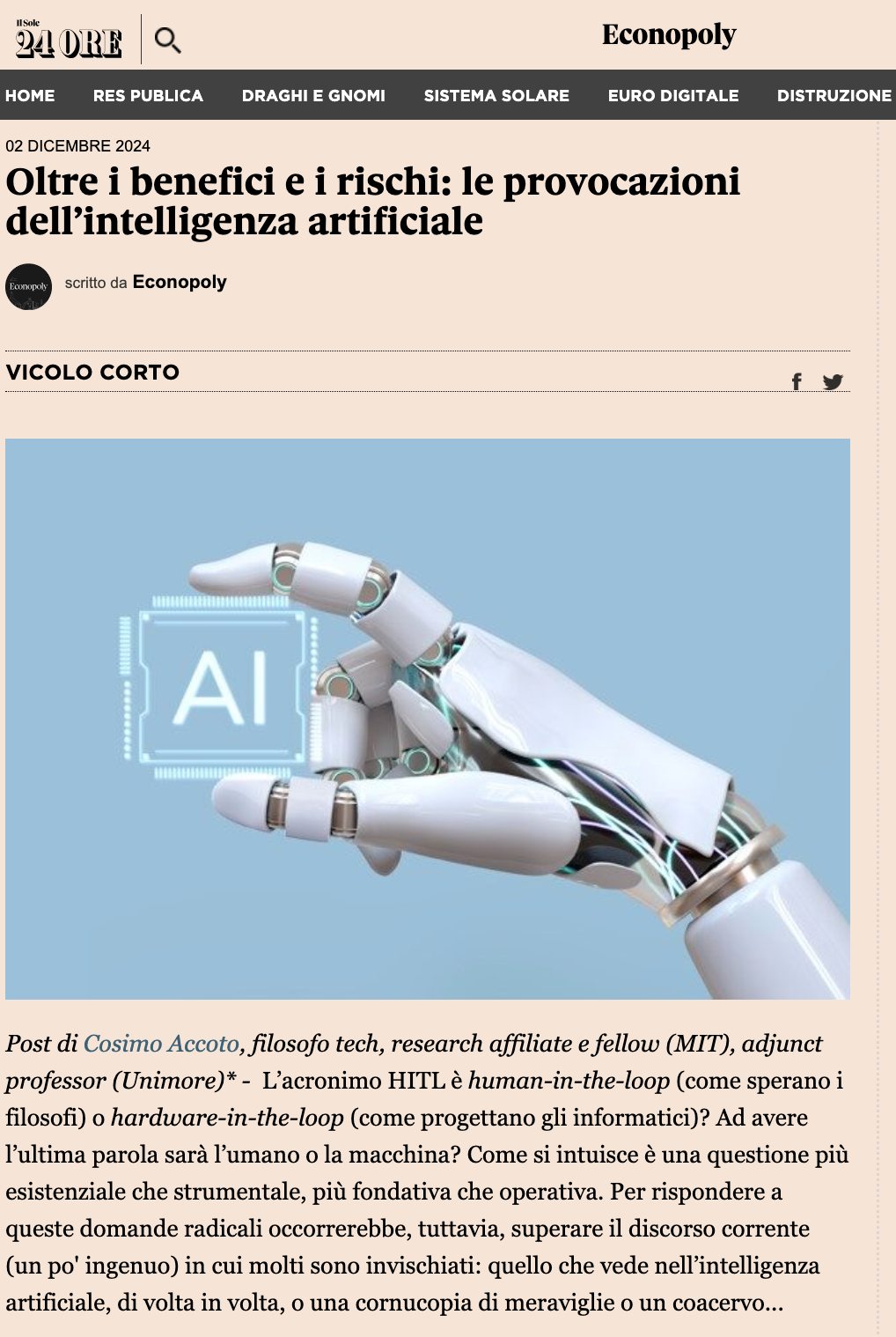Su Econopoly Sole 24 Ore, un mio intervento a partire dal mio ultimo saggio “Il Pianeta Latente”. Dall’inflazione della parola all’invisibilità dell’immagine all’oscenità dell’azione: << L’acronimo HITL è human-in-the-loop (come sperano i filosofi) o hardware-in-the-loop (come progettano gli informatici)? Ad avere l’ultima parola sarà l’umano o la macchina? Come si intuisce è una questione più esistenziale che strumentale, più fondativa che operativa. Per rispondere a queste domande radicali occorrerebbe, tuttavia, superare il discorso corrente (un po’ ingenuo) in cui molti sono invischiati: quello che vede nell’intelligenza artificiale, di volta in volta, o una cornucopia di meraviglie o un coacervo di pericoli. C’è una terza opzione. Riuscire a guardare non solo alle possibilità economiche e alle vulnerabilità sociali che si produrranno, ma alle provocazioni culturali che l’intelligenza artificiale ci viene proponendo (continua a leggere qui al link … https://www.econopoly.ilsole24ore.com/2024/12/02/benefici-rischi-intelligenza-artificiale/)
