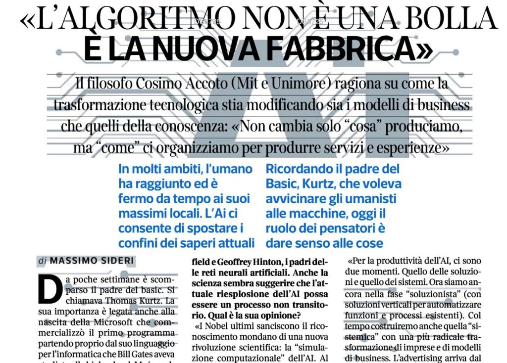 Sul Corriere Economia di ieri una mia lunga intervista brillantemente curata dal giornalista Massimo Sideri che anticipa i temi del prossimo appuntamento dei Business Break di BIP che mi vedrà ospite mercoledì 11 dicembre e in streaming su Corriere TV. Un grazie a Massimo Sideri per l’interesse verso la mia esplorazione filosofica e la conversazione/intervista che ne è scaturita. E un ringraziamento a BIP per l’ospitalità calorosa e per l’invito a dialogare con Donato Iacovone, Presidente Esecutivo di BIP, nel corso di questo nuovo appuntamento. Maggiori info qui >