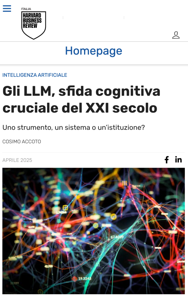 Oggi su Harvard Business Review un mio intervento speculativo e filosofico sull’intelligenza artificiale linguistico-generativa letta come: (a) strumento, (b) sistema, (c) istituzione. Un’esplorazione strategica azzardata sul senso e sul destino dei modelli linguistici su larga scala oltre la dimensione strumentale verso quella istituzionale. Un grazie al direttore di HBR Enrico Sassoon per l’interesse verso le mie esplorazioni filosofiche, per l’invito a contribuire alla discussione a partire da un suo dialogo e per l’ospitalità calorosa …