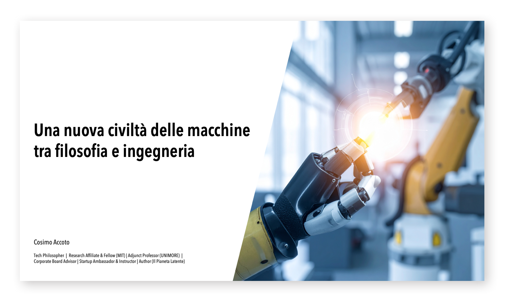 [abstract] Dalla computazione alla simulazione, l’automazione sta entrando oggi in una sua nuova fase di evoluzione ingegneristica accelerata e di espansione produttiva planetaria. Intelligenza artificiale e robotica industriale spinte da dati, sensori, programmi, algoritmi, primitive e protocolli stanno scardinando l’orizzonte macchinico dei modelli classici dell’automazione strumentale aprendo ai nuovi paradigmi di frontiera dell’autonomia agentica. Da strumenti ad agenti, siamo all’alba di una nuova civiltà (ed economia) delle macchine: simulate, gemellate, distribuite, coordinate, virtualizzate e in grado di agire in progressiva autonomia e in futuro anche di transare direttamente divenendo sorprendenti attori economici dentro nuovi mercati artificiali. Esploreremo insieme, tra filosofia e ingegneria, opportunità, vulnerabilità, immunità potenziali di questa nuova era dell’iperautomazione >> (Accoto 2025)