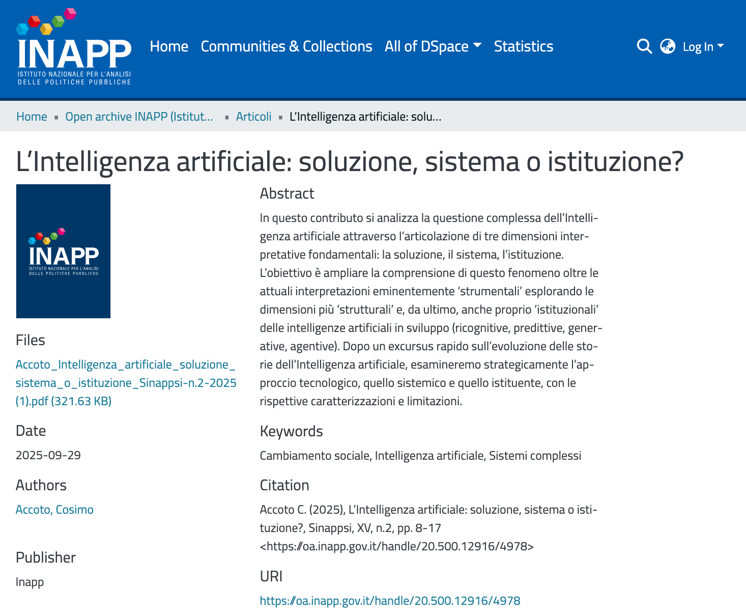Pubblicato e disponibile in open access: Accoto C. (2025), L’Intelligenza artificiale: soluzione, sistema o istituzione?, Sinappsi, XV, n. 2, pp. 8-17. Sinappsi è la rivista quadrimestrale di INAPP, l’Istituto Nazionale per l’Analisi delle Politiche Pubbliche.