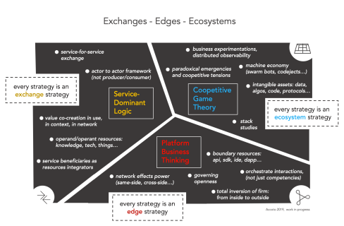 “Le metafore atmosferiche e geografiche della computazione si ampliano. Per criticità architetturali come privacy, latency, security, connectivity ed efficiency, la computazione si è venuta stratificando in layer sovrapposti dai nomi evocativi. Cloud computing, fog computing, edge computing mappano, oggi, figurativamente i dove della computazione, le sue locazioni: sulla nuvola, nella nebbia, al margine del mondo. C’è, dunque, una topologia e molte topologie della computazione, una geografia e anzi più geografie del processare l’informazione, una e molteplici spazialità per in-formare il mondo. Queste collocazioni della computazione sono anche e però configurazioni della computazione. Il rischio è che i “dove” locativi tendano a oscurare i “come” normativi della computazione. A detta degli esperti, la nuvolo-natività (cloud-nativity) è altra cosa dal mero trasferimento di preesistenti applicazioni e servizi sulla nuvola. Così, il cloud non è tanto il luogo della computazione, ma è soprattutto il modo della computazione. Come per il computing al margine incarnato dai sensori/attuatori dei nodi di edge e dal layer dei fog gateway. La computazione alla marginalità del mondo è più un modo d’essere del mondo che un luogo dello stare al mondo” (Accoto 2019, poscritto a Il mondo ex machina)